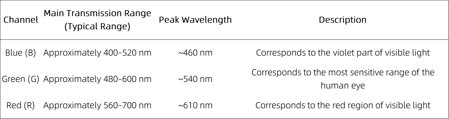 - R (Red), G (Green), B (Blue) channels of the CMOS sensor record these respective wavelength bands.
